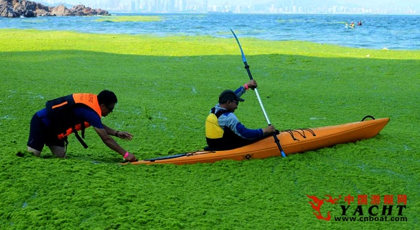 ![]() 近日,山东青岛,随着连日的南风吹刮,漂浮在外海的大面积浒苔进入近海海岸。7月4日,一群皮划艇爱好者在一海湾训练,皮划艇通过堆积浒苔的海面时犹如草原上的旱船。 |
