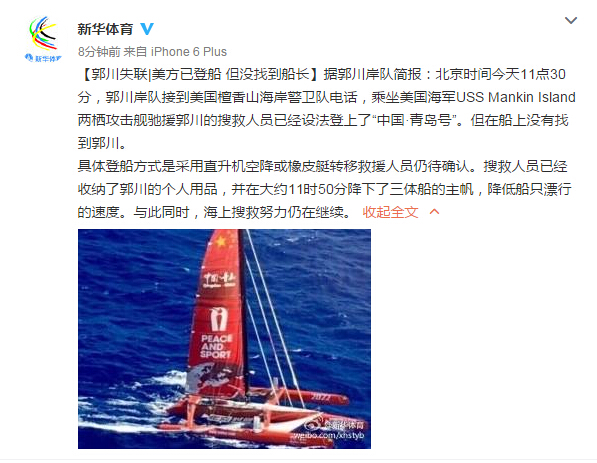 北京时间10月27日中午,距离郭川在25日下午失联已经过去将近48小时。而搜救前方再度传来令人揪心的消息:美国海军派出的搜救人员已经设法登上了郭川的“中国-青岛号”。但在船上没有找到郭川。 郭川在旧金山出发前的照片 北京时间10月27日中午,距离郭川在25日下午失联已经过去将近48小时。而搜救前方再度传来令人揪心的消息:美国海军派出的搜救人员已经设法登上了郭川的“中国-青岛号”。但在船上没有找到郭川。 据新华体育微博消息:北京时间今天11点30分,郭川岸队接到美国檀香山海岸警卫队电话,乘坐美国海军USS Mankin Island两栖攻击舰驰援郭川的搜救人员已经设法登上了“中国·青岛号”。但在船上没有找到郭川。 具体登船方式是采用直升机空降或橡皮艇转移救援人员仍待确认。搜救人员已经收纳了郭川的个人用品,并在大约11时50分降下了三体船的主帆,降低船只漂行的速度。与此同时,海上搜救努力仍在继续。 |