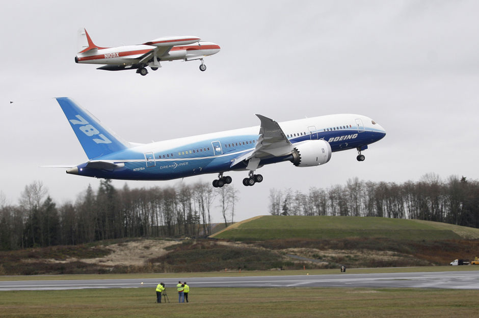 波音787冲破雨雾完成首飞