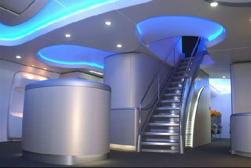 波音公司1月18日向公众展示了实物尺寸的新型747-8洲际飞机的客舱内饰。展示分为两层,呈现了747-8飞机独具特色的内部结构。