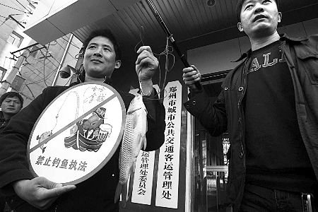 3名司机认为郑州市客运管理处属于“钓鱼执法”,拿着一条被钓上钩的鱼走进客运管理处,要讨个说法。 今年3月初,郑松伟驾车从郑州市回新密途中,带了4个要搭便车的人,被郑州市客运管理处以“涉嫌非法营运”查处,车辆被暂扣了17天。此外,还有另外两名司机也遭遇到相似情形。昨天,这3名司机认为郑州市客运管理处属于“钓鱼执法”,拿着一条被钓上钩的鱼走进客运管理处,要讨个说法。 对此,客运管理处表示,郑松伟非法营运的事实清楚、取证确凿、暂扣车辆依据充分、定性准确、执法程序合法,不存在当事人向外称的“钓鱼执法”现象。 几名司机给客运管理处送条大鱼 昨天上午,在郑州市客运管理处门前,两名男子的举止引起了众人关注,只见一个男子手持钓鱼竿,鱼钩上钓条大鱼;另一男子举着牌子,牌子上画着一幅漫画:一个执法人员坐在船上,钓起一条大鱼,嘴里说“哈哈,拿钱”。漫画的整体类似交通禁行标志,不过内容是“禁止钓鱼执法”(如图)。 据其中一名叫郑松伟的男子介绍,3月4日晚9点多钟,他驾驶五菱之光面包车从郑州市区回新密,途经嵩山南路黄岗寺村附近时,发现三男一女站路边,向他招手示意停车。 郑松伟称,他在老家经营服装生意,突然遇到有人拦车,以为是熟人遂停车。“我说去新密,对方说去新密白寨,想搭个便车。”几人上车后,他并未收取任何费用。前行约1公里,乘车的一名男子要求在路边的加油站停车。“车刚停下,突然冲来五六个男子,把我拽下车。”郑松伟气愤地说,几人既没有穿制服,也没有出示证件,只声称是郑州市客运管理处稽查人员,以其涉嫌违法拉客暂扣车辆。 “我好心捎人回新密,却被扣上非法营运的帽子,心里说啥也想不通。”事发时,郑松伟拒绝在车辆暂扣凭证上签字。 此后,经过郑松伟多次向有关部门反映问题,车子终于在被扣17天后归还,对他则免予处罚。车辆被扣和归还,均没有得到任何手续。 “这就是钓鱼执法!”事后,他了解到和自己遭遇类似的司机,远非他一个人。郑松伟称,在此之前,几人并不认识,他们能走到一起,是在投诉时相识的。 找中间人花几千元可以把被扣车弄出来 另一个车主袁华明表示,2月24日上午9点,他驾驶面包车行至瑞达路,一男子拦车称去汽车南站拉些货。双方商定,运费为80元钱。车行至南站,男子还未装货,便丢下100元钱离开车,并高喊“在这儿”。 “我不知道啥情况,就被客运管理处的人围住。说我非法营运,将车暂扣,并要罚款2万元。”袁华明说。 面对处罚,袁华明随即托关系找熟人想尽早把车子弄出来。几天前,他委托的一个熟人要走了4000元,说可以摆平此事。这个熟人称,其中3000元作为罚款上交,另外1000元分别买了500元的油卡和500元购物券,交给客运管理处的一名书记。 在此期间,袁多了个心眼,将双方对话录了下来,并把这个影像资料交到郑州市交通委优化办。之后,车辆很快就归还了,4000元也被熟人退了回来。从车辆被扣到归还,整整用了29天。 还有一个车主叫李淑军。据她介绍,3月7日,她的车停在郑州火车站自家超市门口卸货,来了两个人说要去南站运货。她不同意,可对方还主动帮其卸货,临走时扔下30元钱。“车子根本没动,就被客运管理处的处罚为涉嫌非法营运。”通过中间人运作,李淑军花了6000元将车弄了出来。后来,随着她不断投诉,中间人又把这些钱全部退回来。 李淑军称,她的车被扣在陇海西路停车场8天,取车时被告知每天收费20元。交了160元停车费后,停车场未开具票据。待开车时,她发现丢了半箱油。停车场工作人员赔偿了120元钱。 【疑惑】 既然涉嫌违法为何不作处理就归还车辆 既然车辆涉嫌非法营运,为何找中间人说情就能变更处罚金额?如果客运管理处没有过错,为何将车辆暂扣17天不作处罚后归还?郑松伟对此表示不解。 昨天上午10时30分许,郑松伟等人举着鱼竿、拿着大鱼来到客运管理处。几名司机在二楼信访科吃了闭门羹后,来到五楼客运管理处纪委询问。在503室,一位女工作人员称自己不能负责这件事,更不能代表客运管理处。车主们要求联系领导。她拨打一阵电话后表示,领导都开会去了。 得到这个信息,几位司机把鱼放到了503室的办公桌上,并说“鱼送给你们了”,随即离去。 几位车主表示,不想背负非法营运的名声,他们要求客运管理处公开道歉,并赔偿扣车期间造成的经济损失。 【回应】 未作处罚是因情节轻微 面对几位司机的质疑,昨天下午,郑州市客运管理处信访投诉科王科长表示,此事已引起他们的高度重视,并在随后给记者传来了一份调查情况说明。 客运管理处提供的调查情况说明称:郑松伟在车辆被查扣后,隐瞒实情以车辆被盗抢为由报警,并向新闻部门提供不实情况,影响我处正常工作,坚称自己没有从事非法营运。我处稽查部门向其出具现场查处影像资料等证据后,郑松伟在事实面前无法自圆其说,又改口称自己被“钓鱼执法”。客运管理处纪检监察室对整个事件进行了调查,认为该车非法营运事实清楚、稽查大队取证确凿、暂扣车辆依据充分、定性准确、执法程序合法,不存在当事人向外称的“钓鱼执法”现象。因该车系首次被我处查处,情节较轻微,决定进行告诫登记违法行为后,不予罚款处罚。 王科长认为,投诉人称中间人协调降低处罚金额,且表示给“书记”好处费,其情节已经涉嫌严重违规,将向领导反映调查处理