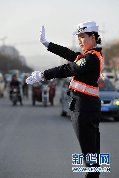 4月14日,在山西浑源,交警毛丽在指挥交通。上岗不到半年竟给县里几乎所有违规的领导干部的车开了罚单,就连公安局的车也未能幸免,前来说情者无一例外吃了“闭门羹”。山西省浑源县女交警毛丽拒为“特权车”开“绿灯”的做法近日在网上引发众多网友热议和追捧,被网友们称呼为“恒山脚下最美女警”。新华社“中国网事”记者日前来到浑源县,近距离接触和了解了这位“铁面”女警。新华社记者詹彦摄