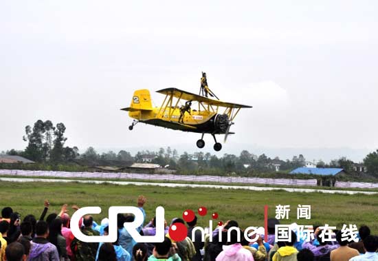 机翼行走 9月30日,2010年首届中国(重庆)国际飞行爱好者年会暨国际通用航空器展示交易会在重庆梁平县开幕。 来自中国及欧美的专业飞行表演队为在场冒雨观看表演的约三万观众上演了精彩的三角翼特技飞行、固定翼飞机通场飞行表演、“机翼行走”、“空中追逐”等特技飞行. |