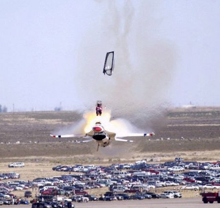 ![]() 从飞机底下弹出。没有飞过尾翼的问题,所以弹射的过载比向上弹射的过载要小得多。但是。这种弹射方法不是所有飞机都适用。因为飞行员的下方经常安装有各种设备,弹射离机时飞机飞行高度不能太低;另外,其过载作用方向是“从脚到头”,很不利于飞行员的生理健康。