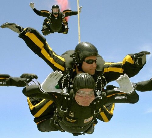 跳伞过生日的老布什,注意嘴角正被强气流撕扯,高速战斗机飞行员面临的风速比这还要强数倍