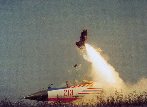![]() 火箭弹射座椅应急离机向上弹射的过程是这样的:飞行员拉动弹射手柄,首先抛掉座舱盖,安全带系统和弹射动力系统随即启动。弹射弹击发后推动座椅上升,而安全带系统工作后,飞行员的肩带被拉紧,其两腿收回并固定;护臂装置展开以限制双臂偏摆,并将飞行员肢体定位锁紧,以避免飞行员在弹射和高速气流吹袭后受伤。座椅弹射出舱后。稳定系统射出并展开,座椅遂稳定和减速。在座椅降到规定的、能安全释放降落伞的高度和速度后,分离系统打开安全锁,人/椅分离。并拉出降落伞。飞行员乘救生伞着陆。 单座飞机在低速飞行遇到应急情况时,使用目前比较通用的打开座舱盖锁,由气动力和冷气或火药燃气抛放座舱盖的方法,往往需消耗0.5秒的时间。只有在这段延迟时间之后,人/椅才能弹离,以避免在空中与座舱盖相撞。在低空应急时,这段延迟时间可能会影响到人/椅弹射成功。 串列双座飞机在遇到应急情况时,通常是后座先抛盖、人/椅弹射;然后是前座抛盖、人/椅弹射。以某双座教练机联动抛盖弹射试验结果为例:要使与飞机脱离的前、后舱盖和人/椅在弹射后互不干扰,就得使前座人,椅在后座舱盖抛放1.486秒之后才能弹射。在这极短的时间内。失事飞机飞行高度的损失达40米,这将严重影响降落伞正常开伞的高度,从而危及飞行员的生命安全。为了提高人/椅弹射成功率,总是希望尽量缩短弹射之前抛盖的时间,于是出现了穿盖弹射。这种方式对飞行员来说,会有较高的脊柱损伤概率及体表或装备刮伤的概率。28页所示为弹射座椅穿盖试验。