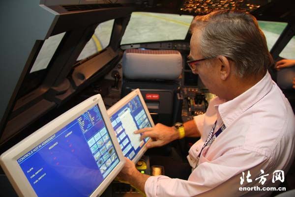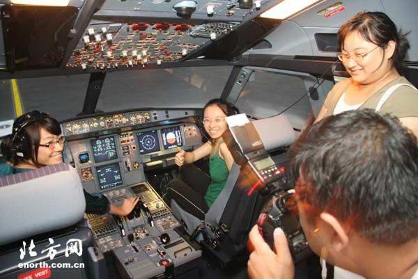 在空客北京培训基地,记者来到和在津总装的空客A320系列飞机一样的模拟机舱中。坐在昏暗的驾驶舱内,四周的液晶仪表面板上显示着红色信号灯、闪烁灯、带灯光的文字指示灯等众多繁杂的参数。在机长马克·赫布特的指令下,记者“驾驶”着空客A320飞机沿着黄色跑道线飞驰起来,随后拉起拉杆使飞机产生上扬的操纵力矩,飞机离地飞向天空。当飞机飞到一定高度后,机长命令记者停止一切操作,关闭手动控制系统,设定航线后,开启了自动飞行系统。机长马克告诉第一次当“飞行员”的记者,飞机的自动驾驶系统可以让飞机按制定的航线安全并准确地飞往目的地。