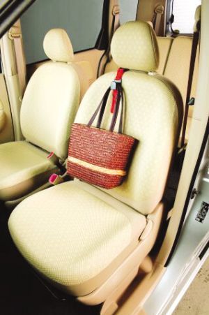 白领女性经常会出席一些正式的场合,往往需要身着正装。但是穿着像西服一样的正装开车,总会让人感觉不舒服,这时车用衣架就派上用场了。你只需把它安装在前座的头枕下方就一切OK了,安装过程可以自己完成。这样在你开车时就可以把衣服挂在衣架上,防止变皱。 参考价格:188元 购物袋挂钩