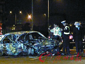 昨日凌晨,白云区太和镇华南快线离帽峰山禾龙水库出口700米处发生交通意外,高速行驶的两私家车相撞,一车被撞后燃烧,车内司机因打不开车门被活活烧死。 事发凌晨零时10分,相撞的两辆私家车的其中一辆内有3人,车右侧被撞得粉碎,碎片散落一地,右边的前轮完全凹进去,前车玻璃也被撞破。所幸司机只受了轻伤,随后被120接走。而另一辆车则被撞得严重变形,起火燃烧,只剩下铁架。从外面看,已经看不到里面有人。但清障车的工作人则说“里面的那个人烧成炭了”。凌晨1时30分左右,殡仪馆车来到现场。由于车严重变形,车门打不开,运政人员只好用铁锹把门撬开。(练情情) |