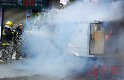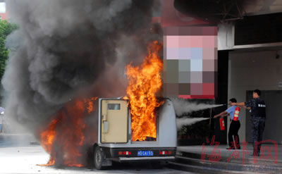 昨日上午9时许,押钞车起火10分钟后火势仍猛,现场气氛紧张,但不少围观的群众,却以为是银行和公安在搞演习。