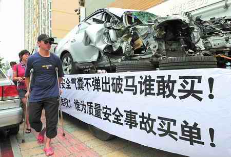 受伤宝马闹市游行 昨日上午,很多途经市中心的市民都目睹了一支稀奇的队伍:尼桑开道,拖车尾随。拖车上躺着一辆银色宝马,车头右侧受损严重,右前车门扭曲,两个前胎都脱离车体。拖车的三面拉着白底黑字的横幅,上书“宝马自然爆胎安全气囊不弹出破马谁敢买!谁为消费者维权!谁为质量安全事故买单!”等字样。 上午9时许,这支醒目的队伍从航空路经人民南路,往天府广场缓缓驶去。一路上,行人纷纷张望,还有人拿出手机拍照。行驶到天府广场后,又开到春熙路路口,然后再回到天府广场。接到报料后赶到的媒体记者,开车加入车队行列。车队从天府广场经过,之后上二环路,经双楠到达位于西门的4S店,此时已是下午1时许。 车主:轮胎气囊有问题 宝马车的主人孔先生就坐在开道的尼桑越野车上。他戴着墨镜,右脚包着白纱布,后座放着两根拐杖和轮椅。 孔先生称,拖车上的宝马是523Li豪华型,2008年1月贷款购买,总价40多万元。今年6月11日凌晨,他驾车行驶到绕城高速29公里+400米处时,在加速过程中,车右前胎突然爆胎,车子瞬间失控撞向路中的隔离带后,又弹到护栏上。随后,与一辆相向行驶的货车相撞。车的右侧便被撞成现在这个样子, 6个安全气囊只弹出来两个,而且弹出时间滞后,导致他头撞到方向盘上,一块钢板断裂后弹出,将他的右脚打断…… 孔先生告诉记者,当初购车时,销售人员口头告知,这款车的车胎是防爆车胎,在爆胎情况下仍能行驶。孔先生感觉受了骗,6月底,他找购车的4S店和宝马公司处理此事,提出,为何右侧撞击如此严重,右侧的三个安全气囊没有全部打开?但一直等到现在,也没有得到答案。无奈之下,孔先生想到用这种方式来引起社会关注,拖车和尼桑都是他租来的。 经销商:将出具书面调查结论 游街完毕后,孔先生坐着轮椅进入4S店。记者看了孔先生携带的资料,在交警出具的道路交通事故认定书上,写着“因右前胎爆胎,操作不当驶入公路左侧停下”。而《四川西华机动车司法鉴定所司法鉴定检验报告书》称该车左、右前轮胎泄气,经检查,分析认为,该轮胎泄气系事故所致。 4S店所属经销商接待了孔先生。经销商表示,这款车配的不是防爆胎,至于为何在右侧车头撞损严重的情况下,右侧的两个安全气囊没弹出,这与当时乘客数量、侧向加速度等都有关系。车祸后,这台车从未到成都经销商的维修中心进行检测。接到孔先生投诉后,宝马派出了技术人员,对该车进行了数据采集和拍照,随后进行汇总和分析。8月5日,德国总部回复邮件,称这台车自带的电脑数据资料显示,安全气囊是及时正常弹出,轮胎不属于自然爆裂。经销商表示,将在本周内向孔先生出具有法律效力的书面调查结论。如果孔先生愿意在此修车,也愿意打折。 昨晚9时许,华晨宝马公关部的孟威联系记者,称此前和成都经销商一直在处理此事,待调查结论出来后将与车主协商解决方案。(成都商报记者 刘婷 钟劼霓) |