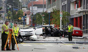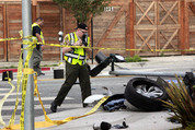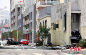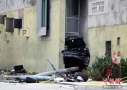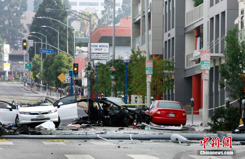 当地时间2014年7月4日,美国西好莱坞,一处街道由于发生车祸而封锁,几辆车互相追赶,一辆特斯拉汽车撞进了一面墙内,造成数人受伤。