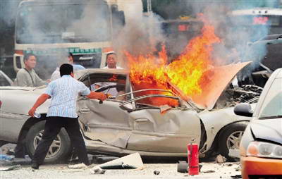 昨天下午2点10分,在东三环长虹桥北侧辅路,肇事司机王加斌驾驶别克君威车剐掉一辆出租车的反光镜后逃逸,逃逸时又撞上一辆普拉多越野车,随后引发6车相撞。事故造成包括王加斌及其车辆在内的6人受伤、9车损毁。目前王加斌生命垂危,事故正在处理之中。 君威撞倒的哥后逃逸 目击者李先生介绍,当时他正在东三环辅路东四街口附近散步,看见一辆君威车撞到了一辆出租,“但这辆浅色君威不但没停车,反而加速逃离。”李先生说,他和其他路人凑上去,发现出租车司机不在车上,而是头破血流地躺在了路边。 交管部门相关人员透露,被撞司机姓赵,是北方出租汽车公司司机,他当时在长虹桥北侧辅路下车问路,把车南向北方向停在非机动车道内。此时,肇事司机王加斌驾车由北向南方向在非机动车道内行驶,不仅撞倒赵某,还将出租车的反光镜剐掉。 逃离200米制造8连撞 肇事的王加斌驾车向南逃逸200米后,再度肇事。 目击者胡先生介绍,当时他正驾车经过事发地,“听见咣的一声,一辆别克君威撞到了一辆丰田越野”,胡先生说,越野车本来是由北向南行驶,被撞击后,车头朝向了东。被撞的普拉多越野车失控后撞向了在最内侧车道的一辆奥迪A6,奥迪车刹车不及,顶上了前方的一辆别克凯越。而几乎同时,肇事的别克君威又撞上了一辆行驶的出租车,并导致另外3辆车(一辆老款奔驰车、一辆别克商务车、一辆420公交车)受损。 交管部门透露,别克君威与普拉多越野车相撞后,君威车发动机处起火燃烧。 肇事君威车基本报废 昨天下午2点半,记者在现场看到,有4辆车还“撞”在一起,其中两车内仍有伤者被困。肇事别克君威车变形严重,基本报废。肇事司机仍困在驾驶室内,动弹不得。 黑色奥迪A6轿车右侧被撞击,反光镜脱落,一旁的别克凯越轿车车尾有明显撞击痕迹。一辆出租车停在路中央,后保险杠脱落,车内一片狼藉,前方是一辆别克商务车。此外,现场还有一辆老款奔驰车和一辆420路公交车停在路边,这两辆车的司机称,他们的车辆在事故中受到剐蹭。 下午2点40分左右,救援人员从普拉多越野车内救出一名男子,急救车将其送往医院。又经过十几分钟的破拆作业,肇事司机王加斌也被救出并送往医院。随即,现场开始清理。下午3点30分,交通恢复正常。受事故影响,东三环辅路北向南方向堵车达三四公里。 伤情 被撞出租车司机脑颅出血 下午3点10分,在北京军区总医院东院烧伤整形科一区烧伤抢救室,肇事司机王加斌依然昏迷。他的两条腿烧伤严重,小腿已烧成黑色,走廊上散发着一股浓重的煳味。十余名医生护士正对伤者展开紧急抢救。 参与抢救的医生向警方介绍称,王加斌伤势严重,双腿均有骨折和烧伤,右小腿和左脚需要截肢。同时,由于车祸和烧伤复合创伤,造成血压不稳,需要经过细致检查,才能确定其内伤情况。截至昨晚,王仍未脱离生命危险。在武警北京总队医院,记者看到多名伤者也在接受治疗。 事故中最早被撞的出租车司机赵先生伤势严重。他的额头和左手臂有明显伤口,米黄色短袖下方沾满鲜血。经医生初步诊断,赵先生脑颅出血。由于赵先生意识不清,直到下午5点半,院方仍未联系到他的家属。 普拉多越野车上的马先生双肺挫伤,面部被擦伤,仍需在ICU内观察治疗。 公交车上的乘客疏散及时,无人受伤;出租车上的一名乘客受轻伤;奥迪车上的刘先生经检查也无大碍。 救援 过路车用高音喇叭号召救援 事发时路过的车辆很多,很多车主都停下来参与到救援中。据现场目击者说,当时事故刚发生,一看见有车起火,一辆路过的工程车赶紧停下,并打开车上的高音喇叭高喊:“大伙快帮忙,拿灭火器灭火!”这一呼喊立刻得到响应,连一些三环主路上的过路车都停了下来,司机们手持车载灭火器,跑向起火车辆灭火。此外,一名男子直接抱来一桶纯净水,跑到起火车前浇了上去。 使馆工作人员自发下楼灭火 事发地旁边就是意大利大使馆,使馆工作人员Giovanni panfili当时正在使馆内。据他介绍,他听到撞击声后,透过窗户看到外面发生了车祸,并已出现火苗,他赶紧向外跑,并找到了灭火器。到了车前,他开始对着火点猛喷。随后和大家一起猛拉君威车门,试图救出被困司机。在救援过程中,他的胳膊被擦伤。 讲述 “我被的哥一把拽出来” 家住长虹桥附近的乔女士是伤者之一,需要住院观察的她讲述了事发时的情景。乔女士说,事发时她正在回家的出租车上,听见“砰”的巨响后,司机喊了一声“坏了”,出租车随即被后面的车撞上了,乔女士全身随着车往前冲,出租车顶到前面一辆车后反弹回来,乔女士又迅速往后仰,“我很清楚地听到自己脖子咔地响了一声”。 司机一边对她喊“下车!快下车!”一边拉开车门往外跑,乔女士说:“我去后备厢拿包。”“还拿什么包,后面着(火)了!”司机一边吼一边跑过来拉开她这侧的车门,“我被的哥一把拽了出来。”乔女士回头一看,后面的车果真着了起来。要不是及时跑出来,可能还真出不来了。乔女士被送到医院后,诊断颈部没有太大问题,但需住院观察几天。 |