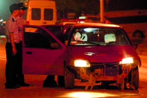 昨日,李天路,警察正在查看肇事汽车。 前晚,顺义李天路樱花园小区附近,数百居民因不满屡次停水,在路上聚集。当晚11时许,“黑车”司机张某载客途经该处时,发现交通被阻断,按喇叭示意人群散开未果,加大油门冲入人群。市公安局新闻办公室称,事件致17人受伤,包括4名执勤民警。经检测,张某系醉酒驾车,被刑拘。 数百居民因频繁停水聚集 前晚11时30分许,李天路东侧路口,通往樱花园小区的道路被封闭。
