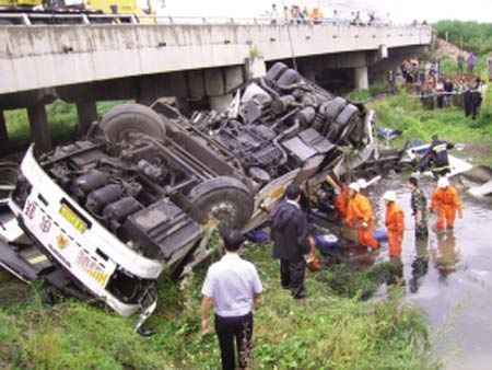 吉林载30名乘客大客坠桥 重伤5人幸无死亡(图)