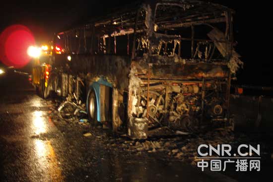 2010年3月6日晚19时30分许,甬金高速公路往宁波方向37公里附近一辆大客车起火,车上38名乘客安全脱身,大客车燃烧一个多小时后成废铁。