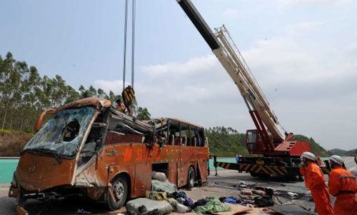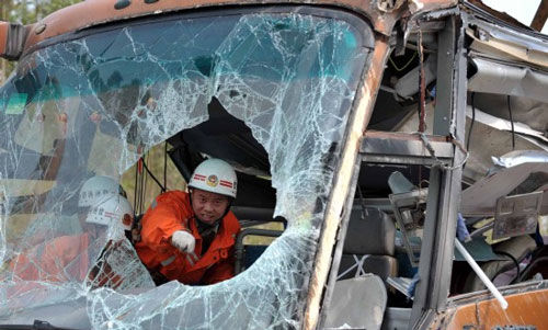 发路段路面洒落大量麦麸,事故车辆挡风玻璃全部破碎,顶部塌陷变形严重,车辆侧翻在公路上。经过消防队员1个多小时的艰难破拆,抢救人员从车上找出6具尸体,加上此前已经发现的6具尸体,此次事故现场死亡人数已增至12人。
