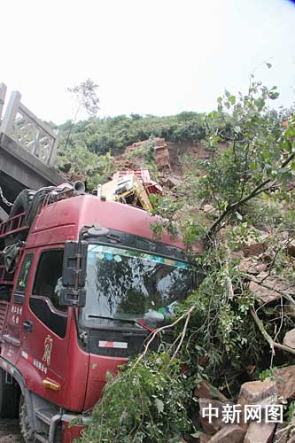 中新社绍兴八月十五日电 ( 江耘余昌龙倪春军)八月十五日上午九时许,一0四国道浙江嵊州三界镇清风桥路段发生山体塌方,一万多立方山石袭向一0四国道和清风大桥,造成道路中断,正在行驶的车子被埋山石中。不幸中的万幸,车内的五名遇险人员死里逃生。