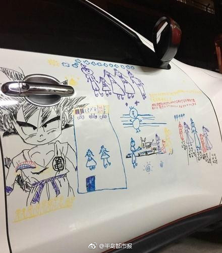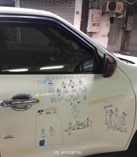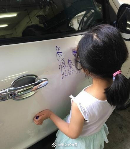 女儿在车上画画 爸爸表示宁被开罚单也不擦