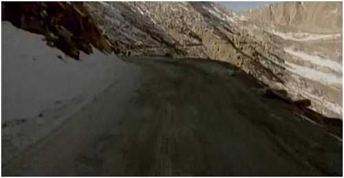 下山的道路在山的另一面,由于路段背阴,路上都有积雪。所有车辆都在山顶装好雪链之后再下山。很长路段的地面是硬冰,只能打一档,车速控制在8公里左右,轮子不住的打滑,但不能踩刹车。每年这里的路上都会有4-8尺的积雪,而道路上方随时会发生雪崩。雪崩曾把铲雪的推土机推下悬崖,并造成两人死亡。