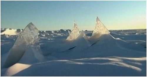 傍晚时分,最危险的路段到了。这一段路是冰冻的波福海——车辆已经从冰河开到了冻结的海上。最后30公里是非常难以预测的路况,因为海水不像淡水那样容易结冻,所以波福海很容易破裂。在路上开过去时,经常看到潮汐造成的巨大裂缝。波浪、潮汐和风还会造成一些锯齿形的冰块,像刀一样伸出地面,叫压力脊。高度从1到4.5公尺不等。千万不能撞上它们。