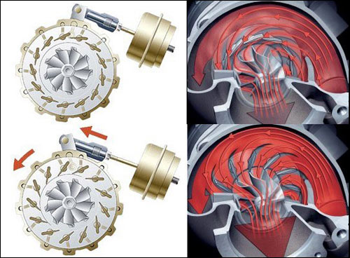 VGT是指Variable Geometry Turbocharger,中文意思就是可变几何涡轮增压器。VGT可变几何涡轮的玄机藏在涡轮里面,在废气通道与废气轮之间,有一圈可调节的叶片,这些叶片由一个驱动器根据发动机转速来调节开闭的角度,从而引导和控制流过该叶片开口处的废气流速度。其实这是一个很简单的物理常识,当流体流量一定时,通过截面较小的通道时它的流速会比较快,VGT就是将发动机低转时流量较小的废气通过一个比较小的缝隙,并且控制废气流成直角去撞击废气轮,从而提升推动废气轮的速度,涡轮就能够获得一个较高的转速。反之当发动机进入高转后,可调叶片就打开较大的缝隙,让高速废气流直接推动涡轮转动。