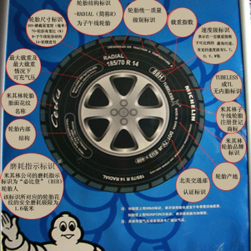 关于轮胎更多的内容请查看 轮胎全攻略专题 轮胎如何选择? 升级轮胎的好处是什么? 轮胎花纹有什么作用?怎么区分? 五大品牌轮胎有什么特点? 轮胎磨损如何处理? 影响轮胎寿命的十大因素 看懂轮胎标志 其实轮胎的标志很好找,就在轮胎的侧面,那一串编号就是轮胎的标志了。 正确运用轮胎首先要认识轮胎,认识轮胎首先要懂得看轮胎上的标志。比如185/60 R14 85H,表示什么意思呢? 195代表轮胎的宽度是195mm;60代表轮胎的高宽比;R代表该轮胎是子午线轮胎;15表明该轮胎内径为15英寸,适用于15英寸的轮辋;H则代表了该轮胎的最高速度可以达到每小时210公里。有些轮胎还标有M+S,表示泥地、雪地适用,TUBELESS表示无内胎,TreadWear表示胎面磨损指数等。对于轿车轮胎来讲,重要的参数之一是高宽比,也就是扁平率,扁平率越小的轮胎,其操控性能就越强。 适时适当地对车辆上的轮胎进行前后换位,以保持轮胎的磨损均匀,延长使用寿命,如果轮胎磨损到磨耗标记处,必须予以调换。 除了制造编号/制造标记外,在胎壁上往往还有轮胎适合使用季节的标记,如WINTER、M+S或AQUATIC、ALL SEASON或ALL WEATHER,这些单词分别表示冬季胎、雨胎以及四季胎,不同地区的用户可根据当地的气候情况选择适合自己的轮胎。