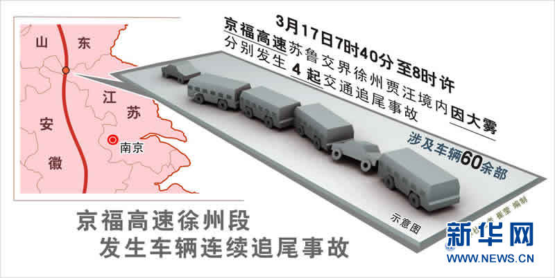 3月17日7时40分至8时许,京福高速苏鲁交界徐州贾汪境内因大雾分别发生4起交通追尾事故,涉及车辆60余部,截至13时,事故共造成6人死亡、30多人受伤,其中6人重伤。