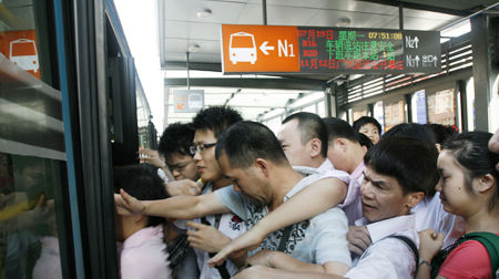 | 广州限行演练首个工作日早上上班时间,BRT棠东站台,乘客互不相让地挤着上车 |