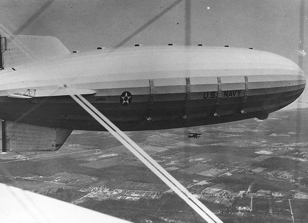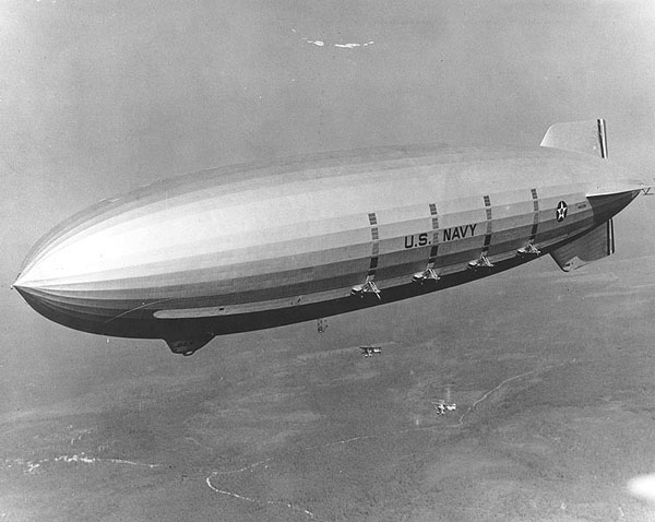 一战结束后,美国军方立即开始研制硬式飞艇,提高海军的空中侦察能力,用以对付日益强大的日本海军。20世纪二三十年代,美国斥资600万美元(在经济大萧条时期算巨资了),造出了两个当时世界上最大的空中巨无霸——“阿克伦”号(ZRS-4 USS Akron)和“梅肯”号。“梅肯”号长240米,直径约40米,有坚固的铝合金外壳,容积达18万立方米,里面是12个充满氦气的大隔间,从而让这个庞然大物可以在空中飘浮飞行。
