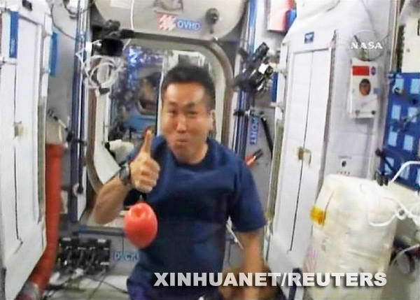 美国国家航空航天局3月20日视频截图显示,日本宇航员若田光一在国际空间站内咬了一口苹果后竖起大拇指。新华社/路透
