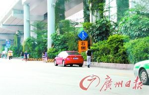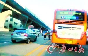 机动车乱停乱放是广州街头常见的镜头。但如果在繁忙的黄埔大道、东风路等路段停放就要小心了。第一,谨防交警来“慰问”;第二,途经的车辆如果车速过快,一不留神可能就会撞上。 图7中的这辆红色小轿车,不仅停在了繁忙的黄埔大道上,而且还偏偏挑了一个前方就是公交车站的地方停放,这让后方的公交车入站时,还要先避让一下它,实在是“耍大牌”! 镜头八:逆向行车