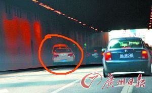 虽然不知道图2红圈中的这辆小轿车为何这般心急非要变道,但是请注意,这里是隧道,而且是装有摄像头的黄埔大道隧道! 隧道因其特殊的环境,是事故频发的较危险路段,所以一般隧道都会有实线和限速标志。交通法更严格禁止机动车在各种隧道内变更车道、超车和随意停车。这一切都是为了机动车的行驶更有秩序,更安全。 镜头三: