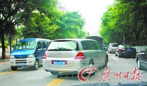 私家车车主最烦的除了塞车就是停车位。当很多车主为“一位难求”而烦恼时,图6中的这位兄弟实在太“幸福”,一车霸了两个车位。不知道是该可怜他的停车技术,还是该可怜他的车品。在此奉劝各位司机朋友,由于广州市停车位稀少,停车时还是各就各位的好。 镜头七:繁忙路段乱停车