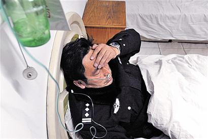 医生介绍,他有恶心、头晕等不适症状。正在吸氧和静脉输液,降低颅内压以缓解头疼,具体伤势需要住院检查。