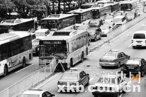 女乘客抢夺司机方向盘 公交失控撞飞护栏(图)