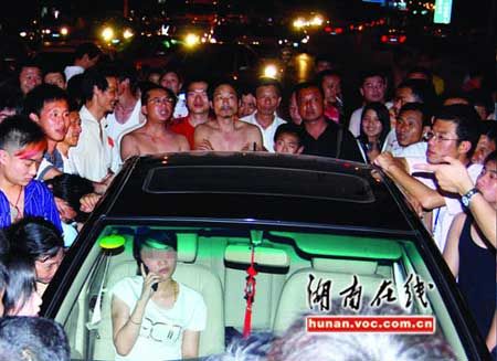 图为市民围住肇事者车辆 三湘都市报5月11日报道 5月10日晚8:30左右,一辆牌照为QCJ7150A5的黑色比亚迪轿车在通过长沙市人民路与湘江中路交叉口的人行横道时,驾车者嫌一路人穿越人行横道太慢,双方发生口角,驾车者下车殴打路人,引起旁观者极大义愤。打人者见状亮出一件警服,说自己身份特殊,谁敢作证打死谁。目前警方已经介入调查此事。 (本文来源:三湘都市报作者:刘惠 李丹) |