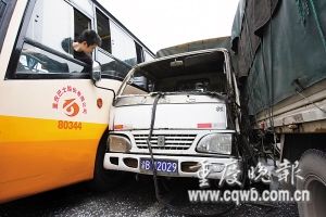 ![]() 长安货车夹在公交车与另一辆货车之间 ![]()