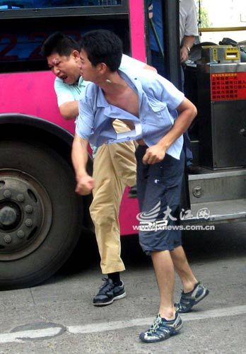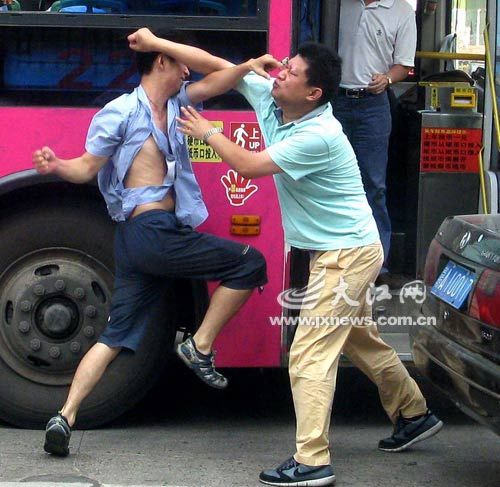 江西都市报7月14日报道  昨日上午9时许,在南昌市洪城路与桃花路交会处,一辆大客车与一辆黑色桑塔纳发生轻微剐蹭。随后,小车司机与大客车司机发生口角。话不投机,两人不顾市民的劝阻,在马路上大打出手。经过一阵激烈对搏,双方打得筋疲力尽时,市民才把两个“火气”大的司机拉开。现场一名市民说,就为一点小事情,在大街上大打出手,这样既不文明,也不雅观,实在有损省会城市的形象。 (本文来源:《江南都市报》 作者:欧阳苏敏 刘虎) majian009
