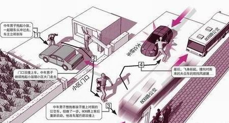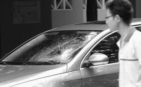 10多秒后,一辆灰色大众车向男子开来。男子突然抱起手里的孩子,飞身跃起,撞向大众车的前挡风玻璃。车主立即刹车,但还是没来得及。男子和手里的孩子结结实实地撞在了车的右前挡风玻璃上,将玻璃撞出了一个脸盆大小的凹坑。撞车后,男子倒卧车下,他手里的孩子则哇哇大哭。