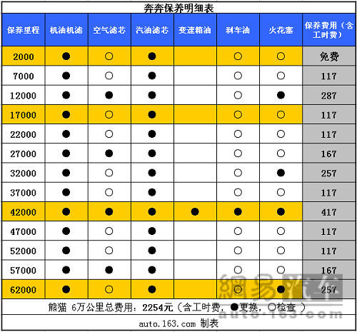 ![]() 网易汽车报道 长安-奔奔由长安汽车集团和世界著名的意大利汽车设计公司I.D.E.A联合设计打造的,奔奔搭载了1.3L全铝发动机。四万元出头就能买一辆动力充足空间比QQ大很多的微车让很多人动了心。俗话说“买车容易养车难”,因此,购车时不仅要关注购买成本,还要考虑到使用成本,即油耗和维修保养费用。下面我们就对奔奔以一年行驶2万公里为例分析一下用车成本给大家一个参考 一、购车成本,1.3手舒最低3万8 ![]() 购车费用常用公式:购车费用公式=裸车价(厂商指导价)+购置税+上牌费+商业保险+交强险+车船使用税 购置附加税:购车款/23.4(1.6升及以下);购车款/11.7(1.6升以上)1.6升以下排量的车型,购置税会得到减半的优惠政策。 验车上牌:此价格仅供参考,具体价格以各地验车上牌价格为准。 车船使用税:各省不统一,北京9座以下客车为480元/年,9座以上客车540元/年。 贷款买车的具体月供额,可到当地的4S店查询。 二、保养和维修 平均每年750元 长安奔奔车型的质保期限是2年5万公里,先到为止。首次保养建议在2000公里左右在4S店做,接下来的保养则按照3个月或者5000公里的周期来做,二保最好不要超过7500公里。奔奔小保一次的费用在120元左右,包括机油机滤和汽滤,汽油滤芯是每次保养都要换的,好在价格不高。奔奔在4000公里左右的时候保养项目比较多,变速箱油和火花塞都要换,总计417元。奔奔行驶6万公里的保养总花费为2254元,平均每年751元。每次保养的里程和保养项目的费用参见下表: