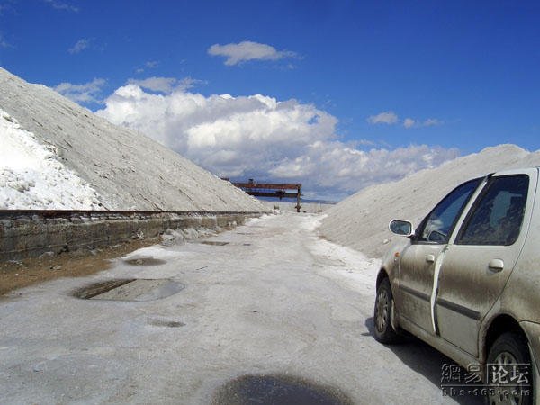 距都兰还有140多公里的地方,拐弯,进了一盐场溜达溜达。佳洁士的广告“进入了洁白的世界”。不过这些粗盐真的很不白,很脏。