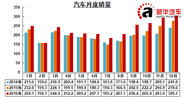 受购置税优惠政策等促进因素影响,2016年我国汽车产销月度销量除2月份以外,其余月份均明显高于上年同期,销量累计增长率呈“直线上升”走势,总体呈现产销两旺发展态势。 12月,汽车生产306.28万辆,环比增长1.73%,同比增长15.04%;销售305.73万辆,环比增长4.04%,同比增长9.47%。其中:乘用车生产264.40万辆,环比增长0.23%,同比增长13.60%;销售267.23万辆,环比增长3.17%,同比增长9.09%。商用车生产41.87万辆,环比增长12.38%,同比增长25.07%;销售38.51万辆,环比增长10.50%,同比增长12.14%。