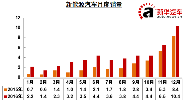 2016年新能源汽车生产51.7万辆,销售50.7万辆,比上年同期分别增长51.7%和53%。其中纯电动汽车产销分别完成41.7万辆和40.9万辆,比上年同期分别增长63.9%和65.1%;插电式混合动力汽车产销分别完成9.9万辆和9.8万辆,比上年同期分别增长15.7%和17.1%。新能源乘用车中,纯电动乘用车产销分别完成26.3万辆和25.7万辆,比上年同期分别增长73.1%和75.1%;插电式混合动力乘用车产销分别完成8.1万辆和7.9万辆,比上年同期分别增长29.9%和30.9%。新能源商用车中,纯电动商用车产销分别完成15.4万辆和15.2万辆,比上年同期分别增长50.2%和50.7%;插电式混合动力商用车产销分别完成1.8和1.9万辆,比上年同期分别下降22.5%和19.3%。