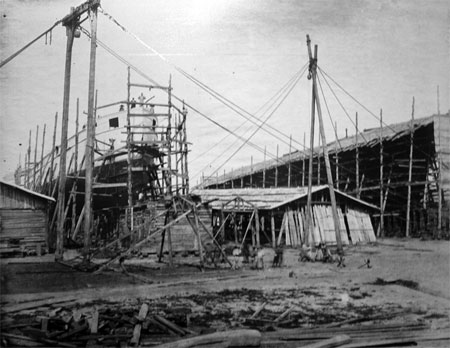 “万年清”即将下水时的照片,可以看到原本垫在船体下方的船台枕木已经被一根根木撑代替。此时的“万年清”船体已经完成,但是桅杆、烟囱等上层建筑还需在下水后装配。