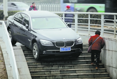 武汉现超牛宝马车 上人行道过桥走台阶下桥