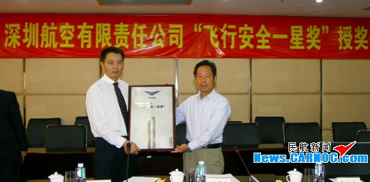 民航资源网2009年2月18日消息:为表彰深圳航空有限责任公司(Shenzhen Airlines Ltd.,简称“深航”)开航以来连续安全飞行超过一百万小时,中国民用航空局(Civil Aviation Administration of China,简称“民航局”)日前授予深航“飞行安全一星奖”荣誉称号。2月18日上午,颁奖仪式在深圳深航总部举行,中国民用航空中南地区管理局(简称“民航中南局”)领导徐麦秋代表民航局向深航颁发了奖牌。颁奖仪式前,民航中南局航安办主任张耀海宣读了民航局表彰决定。